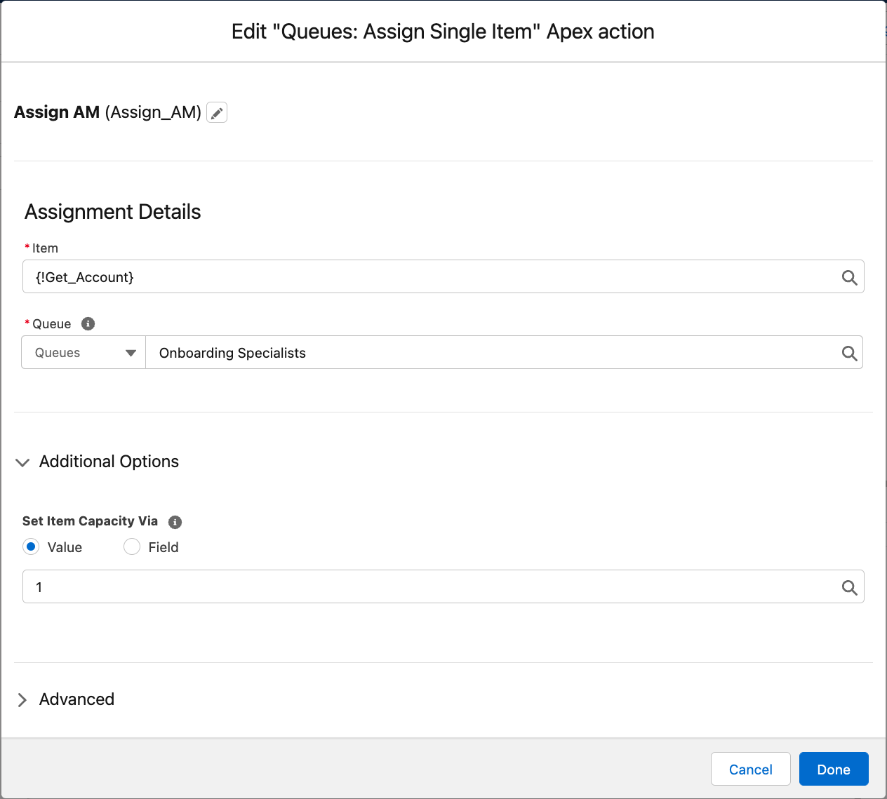 | item               | Yes      | SObject | The Salesforce object to assign                     |
