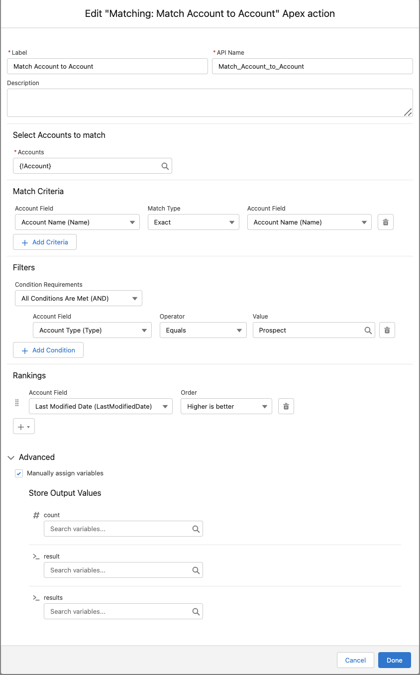 Takes a list of Accounts from earlier in the Flow, finds matching Accounts and provides a list of [AccountToAccountMatch](https://docs.gradient.works/kb/automation-builder-kit-abk/models/accounttoaccountmatch) results for use later in the Flow. The matches can be used for assignment.