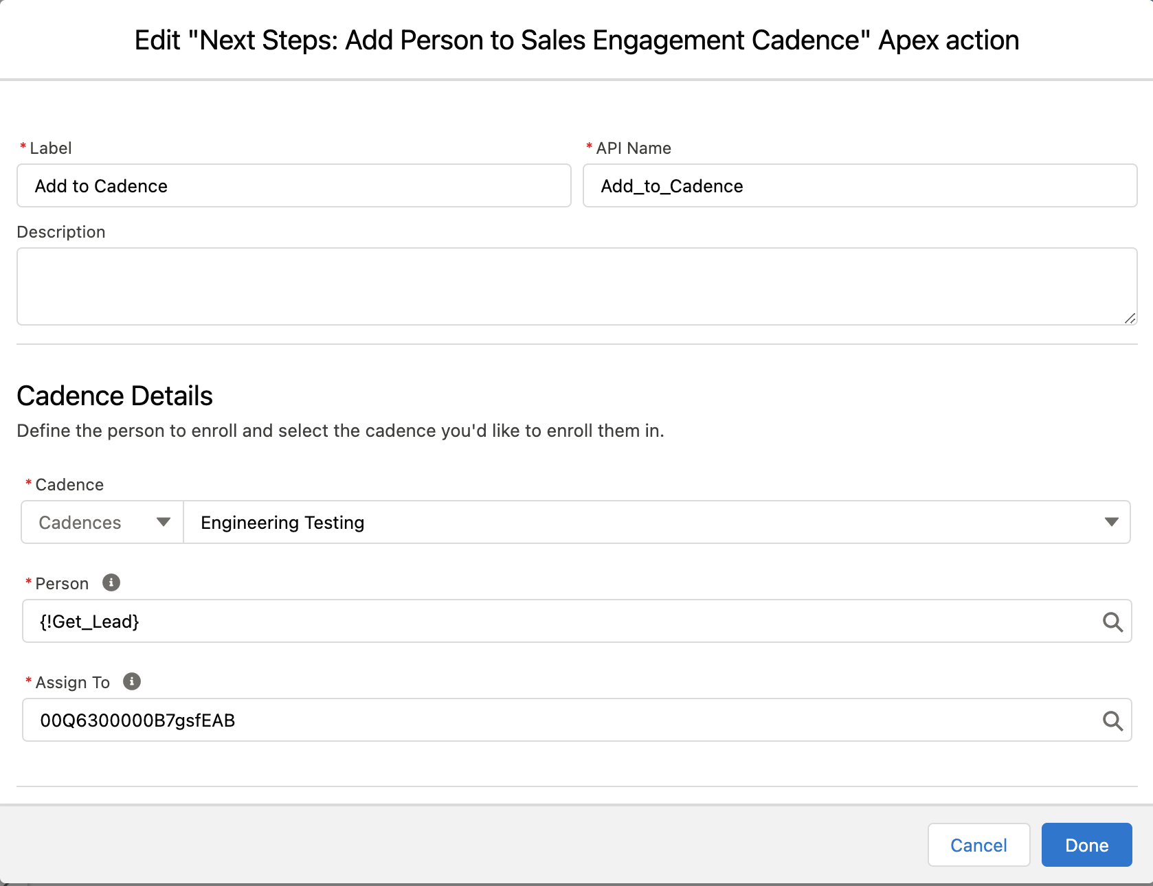 Use this action to add a Lead or Contact to an existing Sales Engagement Cadence and assign them to a specific User in the Sales Engagement platform. If the Lead or Contact already exists in the Sales Engagement Cadence, the action will skip that Lead or Contact.