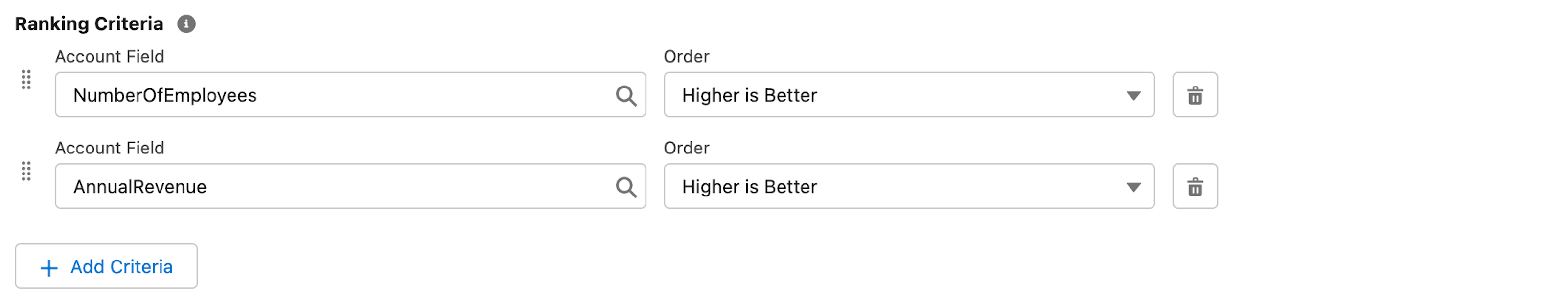 For each criteria, specify an "Account Field" and how to order values in that field. Specify multiple criteria as tiebreakers. For example, in the screenshot above: