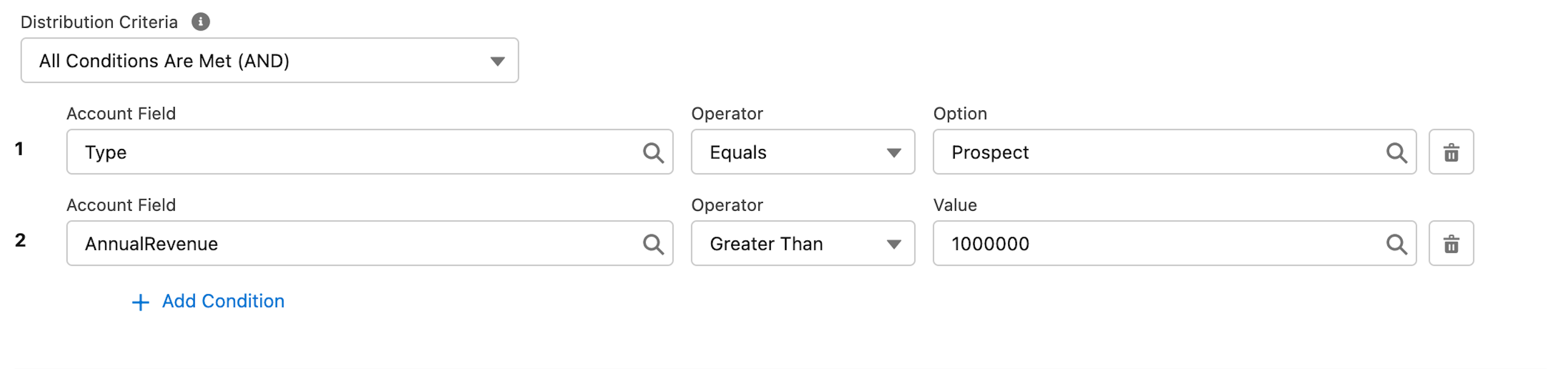 In the example above, Condition 1 matches only for accounts where the `Type` field is equal to `Prospect`.