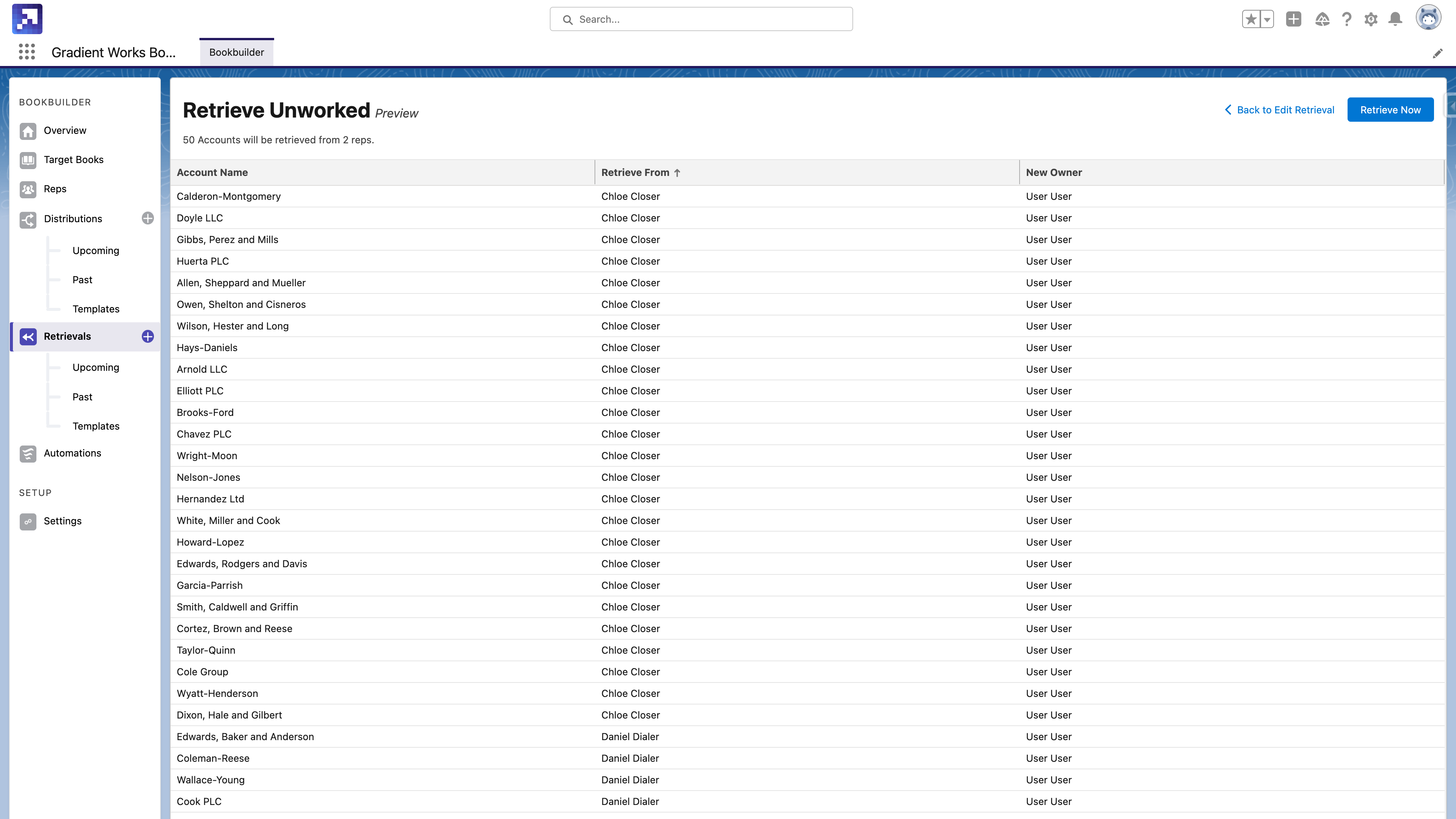 Retrievals allow you to remove accounts from reps and assign them to another user, usually a "holding user" that owns unassigned accounts. This allows you to create a pool of accounts which can be used for [distributions](https://docs.gradient.works/kb/bookbuilder/transfer-accounts/distributions).