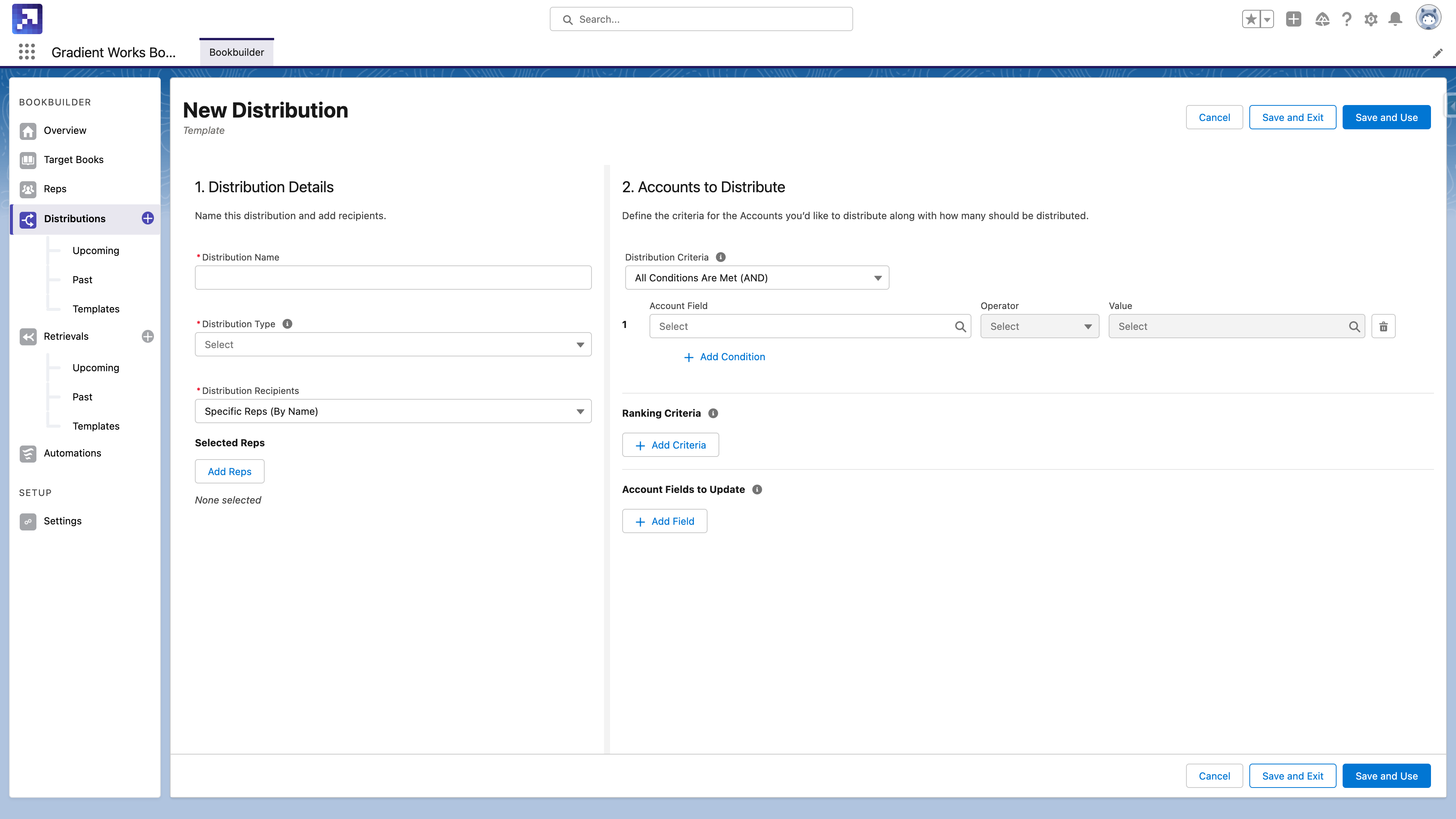 * Sales play distributions - Create a template that contains standard criteria you might use in a sales play. For example, you could create a template that only includes accounts from a specific industry. When you use the template to create the distribution, you could update the industry criteria to include specific ones you want to target.
