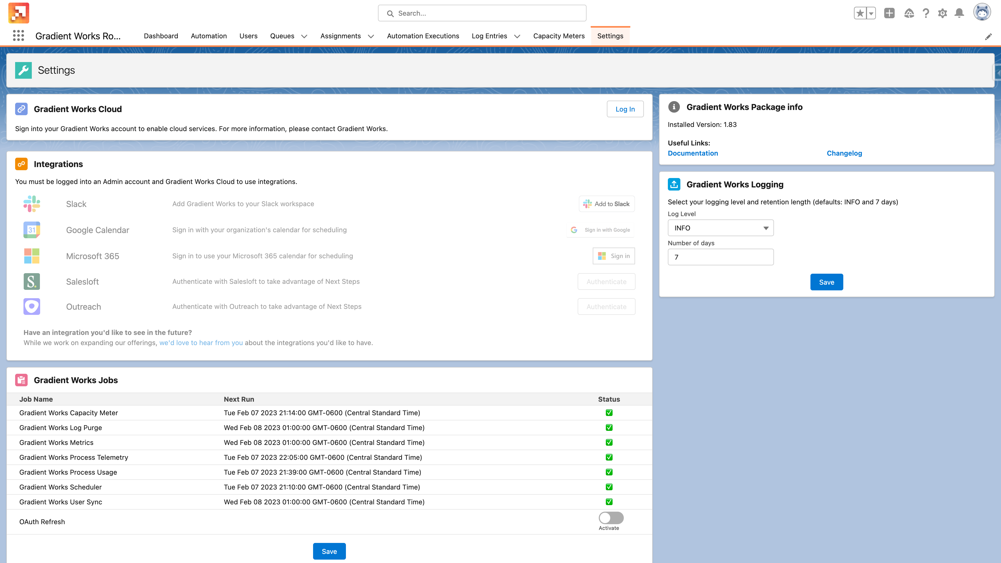 To log into Gradient Works Cloud, go to the [Gradient Works Routing](https://github.com/Gradient-Works/salesforce/blob/main/docs/gitbook/integrations/broken-reference/README.md) app in the Salesforce app switcher and click on the "Settings" tab.