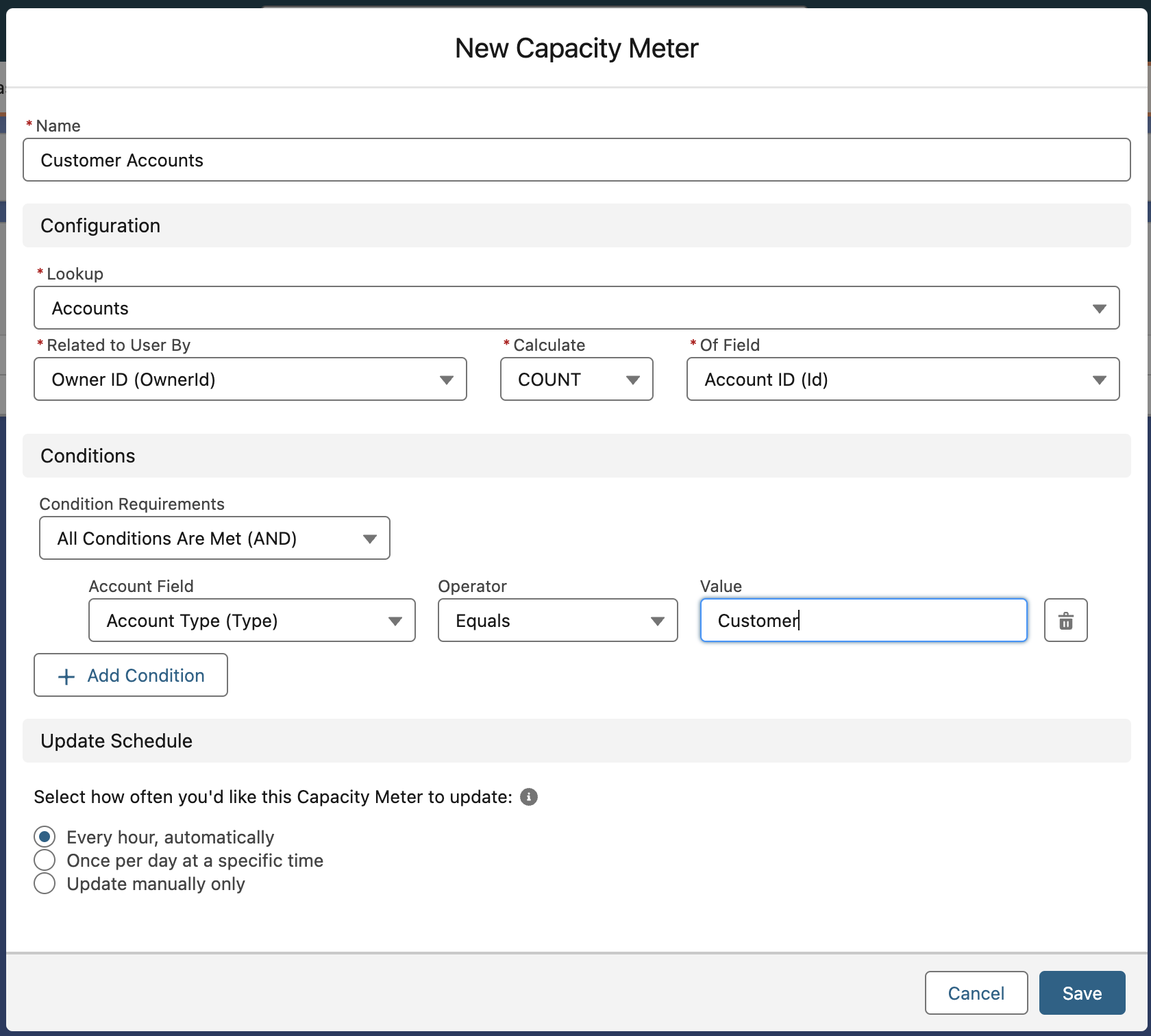 As an example, the provided screenshot configures a Capacity Meter to get the total count of Customer Accounts that are owned by a User.