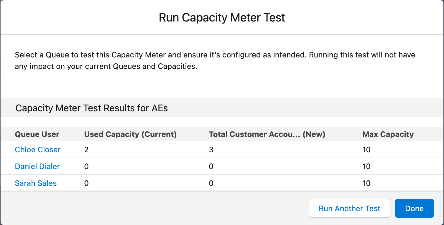 Simply click "Run Test" and select the Gradient Works Queue you'd like to run the test with. We'll return the results for each Queue User in that Queue and show you what their current Used Capacity is and what it would be re-calculated to if you applied the Capacity Meter.